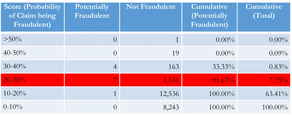 - Substantial lift demonstrated. – on the client test data set it sufficed to examine 7.75% of all claims to identify 91.67% of all fraudulent claims