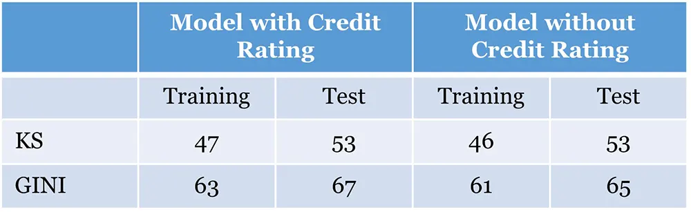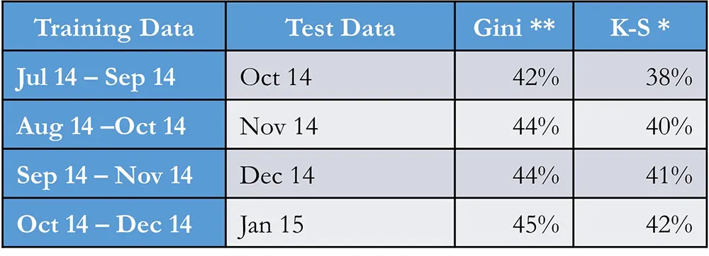 Discriminatory power of the scorecards were high as seen from high KS and GINI