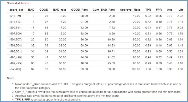 - Model KS = 53.85 (KS > 45 indicates a high quality scorecard)