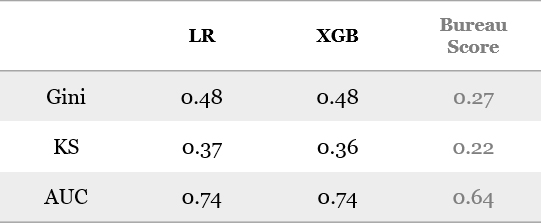 - Performance of both LR and XGBoost scores better than generic bureau scorecard